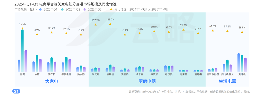 线上烟灶以超150%的增速领跑市场,反映"厨房换新"需求爆发。空调受旺季和政策拉动增速达95.5%,扫地机等清洁电器保持近60%高增长。