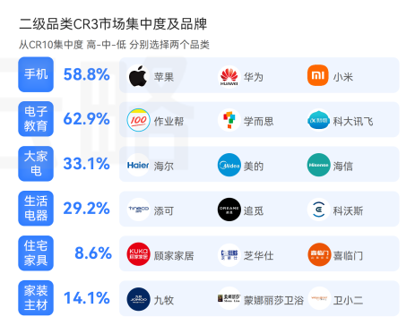 细分行业品类,发现手机/电子教育品类头部品牌垄断社媒内容场,中小玩家难突围;家装类因本地化服务助力品牌据守区域,效应不明显。社媒渠道马太效应呈现两极分化。
