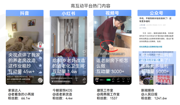 家装方面,适老化内容呈现从单品推荐向整体改造升级的趋势,视频号能抓住长者居家痛点,以最大内容效率领跑;抖音和小红书凭借给家里长辈的适老改造获得高声量。
