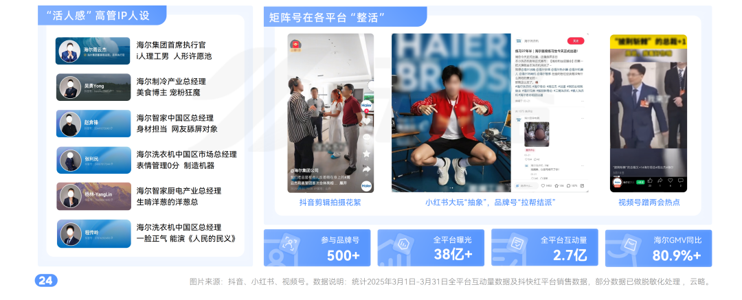 头部品牌海尔周总在“与雷军同框”热点事件后布局高管 IP人设账号,加上已成熟的品牌号,海尔以“高管IP+员工KOS”矩阵实现全平台布局,官方矩阵号通过抖音搞笑剪辑、小红书“恶搞”CEO等内容激发用户共创,带动GMV显著增长。