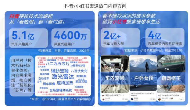 抖音拥有超5亿的汽车兴趣用户,汽车的智能化崛起让用户对技术拆解与场景化体验内容需求激增;小红书则聚焦车生活场景,围绕搜索展开深度决策,呈现差异化内容价值。