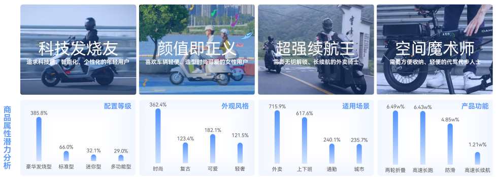 从各属性增长值来看,线上平台的电动自行车消费正呈现四大趋势:科技追求、颜值偏好、续航需求和空间优化。