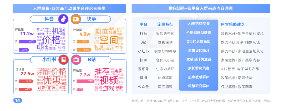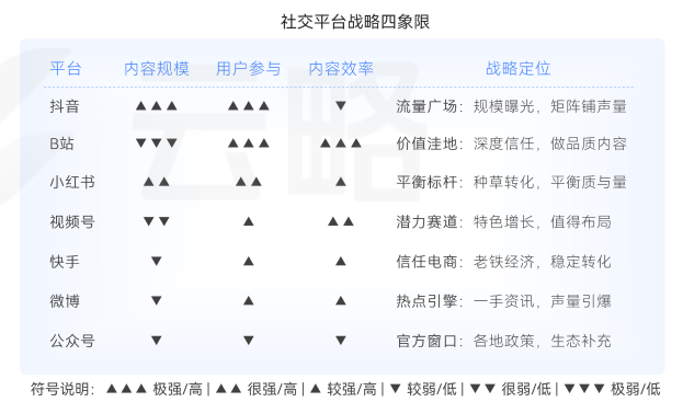 云略发现,国补阵痛期展现出不同平台的内容策略特点:B站做深度,抖音做声量,小红书快手持平产量,视频号做潜力,公众号做承接,品牌可根据不同的营销目标(品牌曝光/深度种草/销量转化)进行组合投放和资源分配。
