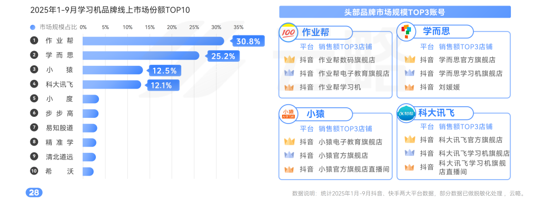 统计学习机品牌的市场规模,教培系品牌包揽前四,作业帮以30.8%的绝对优势领跑学习机市场。