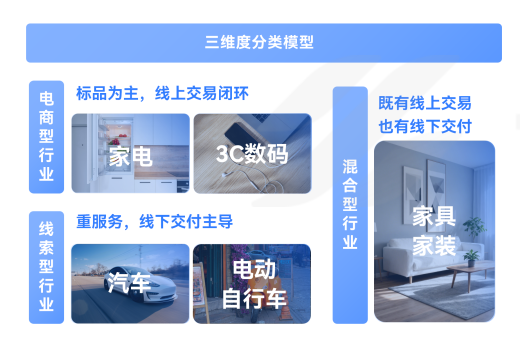 国补行业品类跨度大,云略根据国补5大行业的最终主要成交渠道划分为电商型行业、线索型行业和混合型行业: