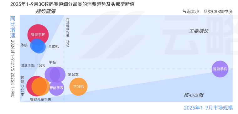 2025年1-9月3C数码赛道呈现高速增长态势,智能手环以超200%增速领跑,台式机与一体机增速均超170%,智能手机以断层式的市场规模稳居核心。
