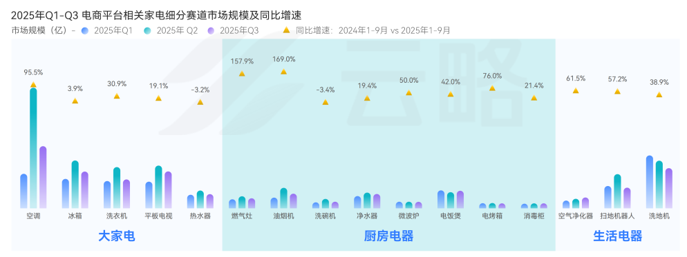 据云略《2025后国补时代5大行业社媒矩阵营销报告》(以下简称“报告”)显示,2025前三季度家电市场整体“暴涨”,其中烟灶品类以超150%的增速领跑,清洁电器保持近60%高增长。