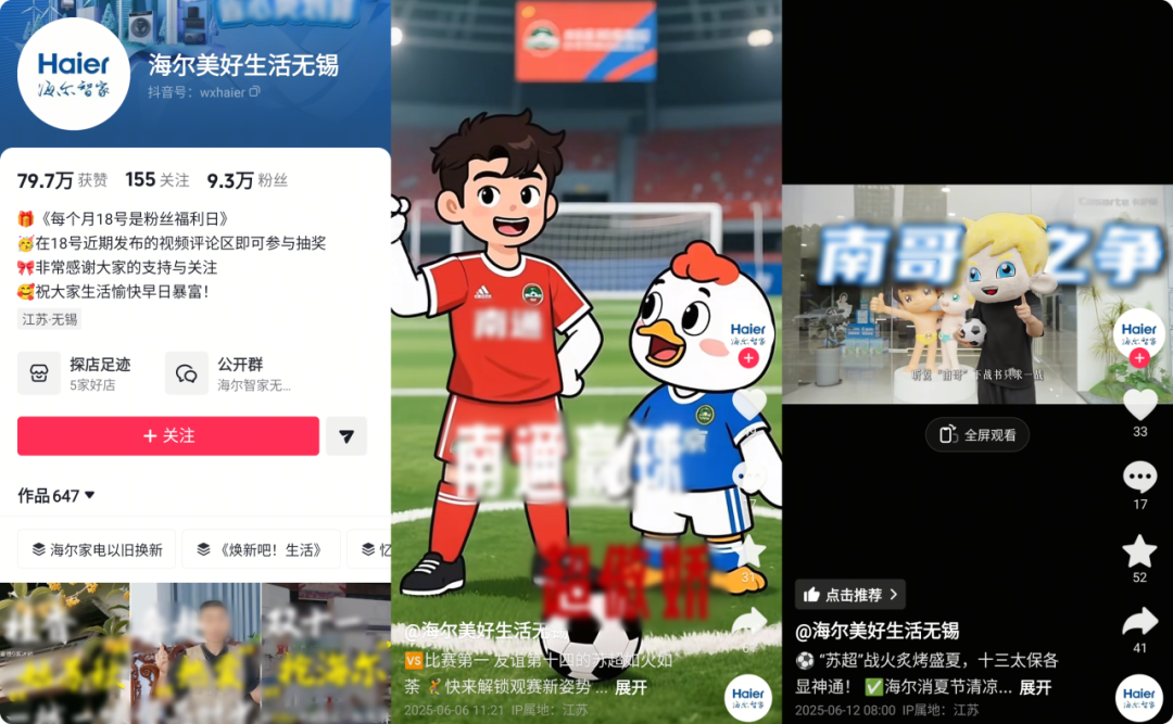 另一成功案例是@海尔美好生活无锡,该账号巧妙结合"苏超"足球赛事热点,通过“比赛第一、友谊第十四”、“南哥之争”等爆梗内容提升曝光量,成功将赛事热度转化为品牌关注。