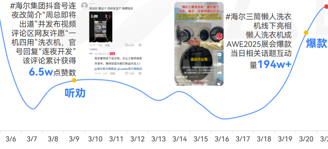 3天后放出懒人洗衣机产品图,并称“我们早有准备”,话题#海尔主打一个听劝 阅读破1700w;10天后线下展出,当日互动量破194w,成功引爆市场。