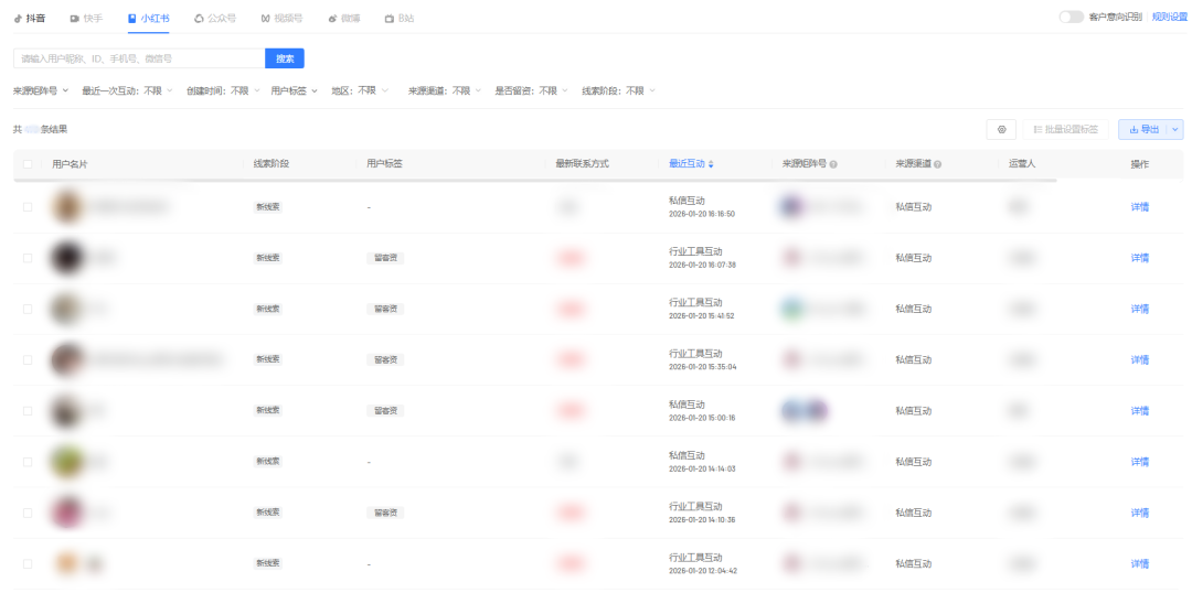 不止于此,所有账号的意向线索AI识别,汇总至「线索管理」,列表化直观呈现高意向线索。