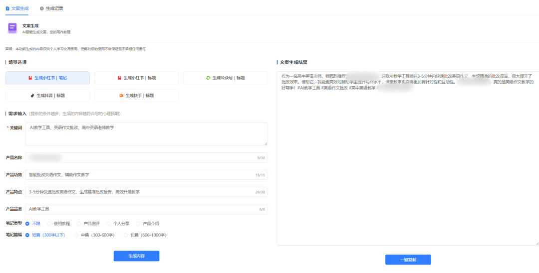 运营人员使用 「文案生成」功能,输入“高中英语”、“AI批改”等核心主题,即可快速获得包含标题、正文、话题标签的完整笔记草稿。