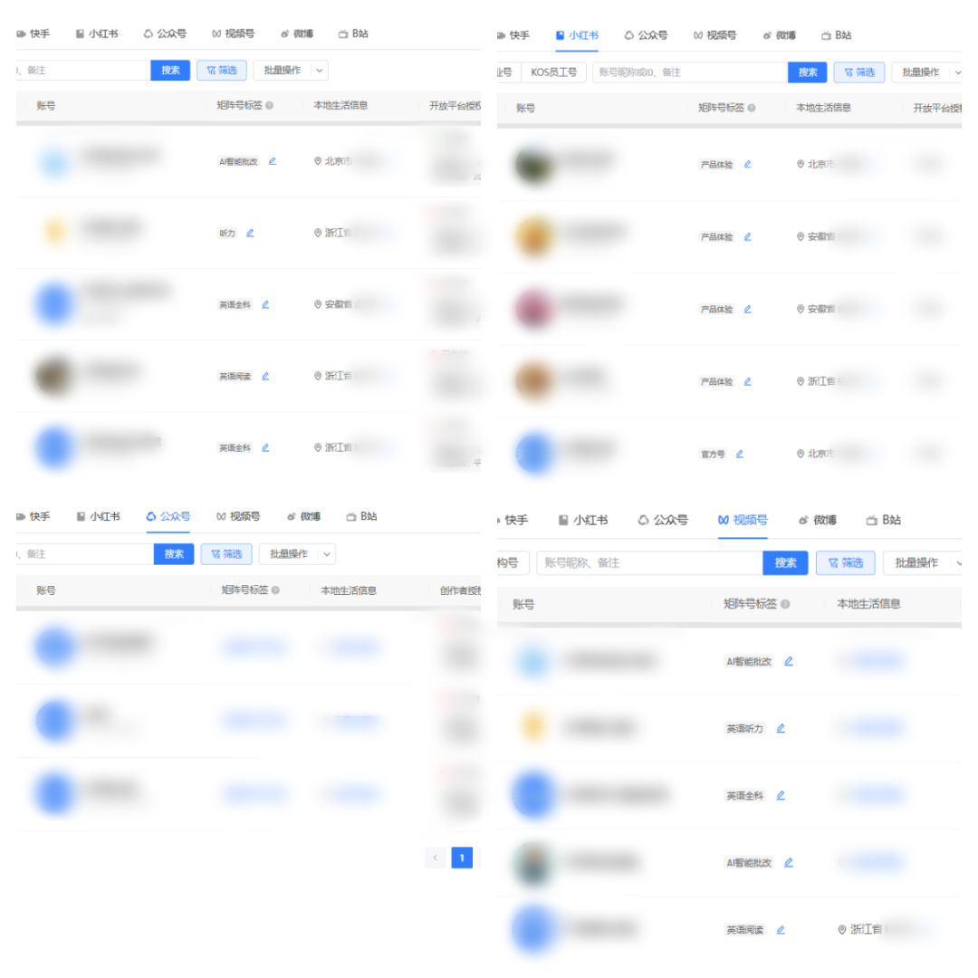 系统将所有分散于抖音、小红书、视频号、公众号、B站的官方号与教师个人号,统一纳入一个工作台进行管理。运营负责人可全局查看各平台、各类型账号的状态、任务与数据,实现了从“分散游击”到“集中指挥”的转变。