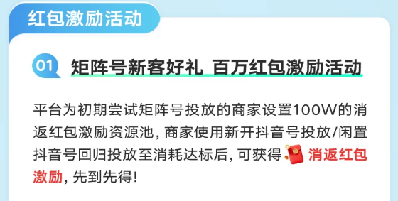 新客好礼:新开抖音号或闲置号回归,有效投广≥3天,即可获得消返红包;