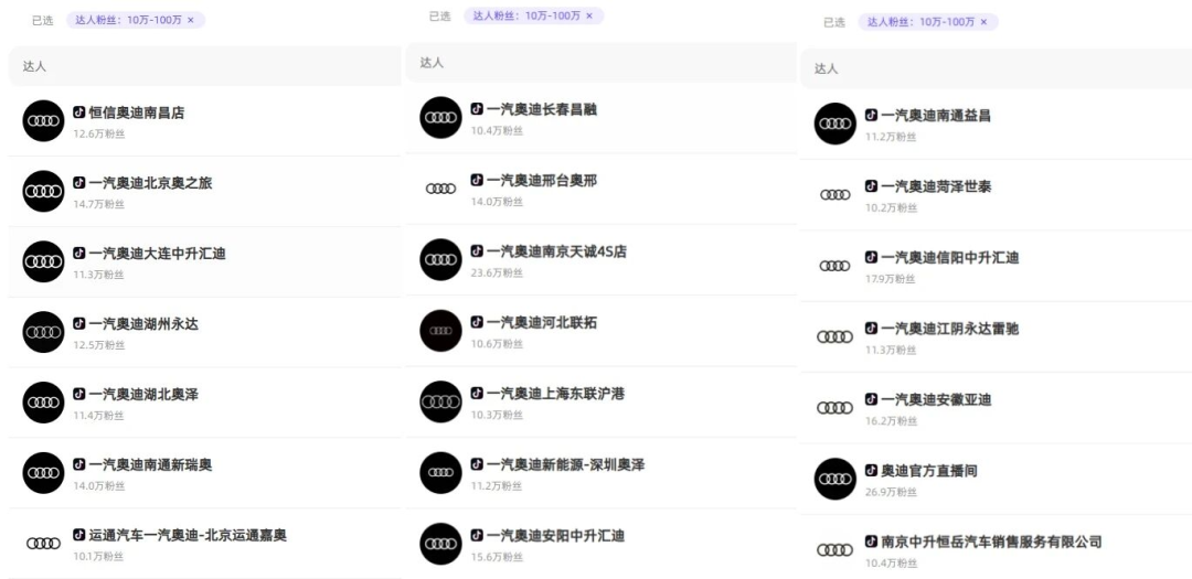 如云略就曾统计过一汽奥迪在抖音搭建的账号数便高达7000+个,预估有一半是粉丝数10w以上的门店经销商账号,这些账号组建成一张覆盖全国的本地化传播网络。