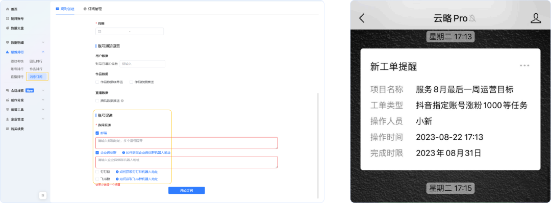 除核心功能外,云略提供消息订阅、专属培训、日常客服、周期性数据复盘等全周期服务,支持通过企微、钉钉、飞书、邮箱推送数据阈值告警,确保关键信息实时触达。