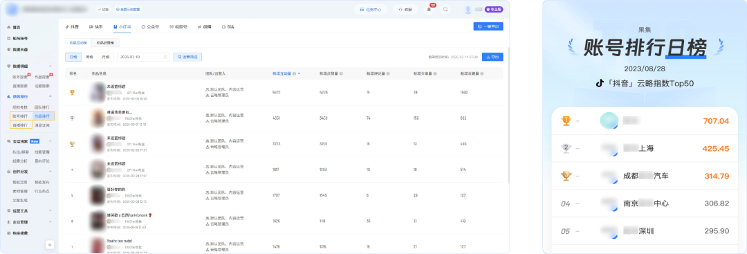 同时系统自动生成账号、作品、直播、绩效等多维榜单,总部可快速定位优质账号与高潜区域,以排名激励团队,有效提升运营自驱力。
