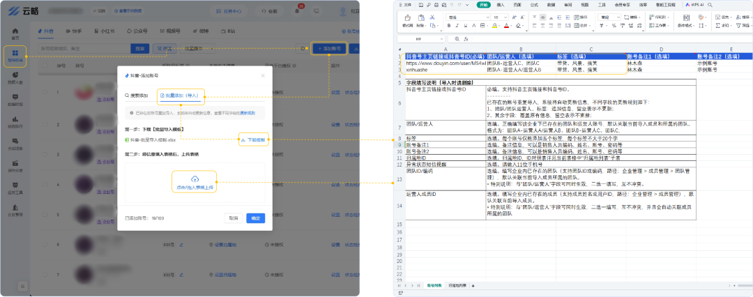 云略实现超大规模账号与人员的精细化管控,支持抖音、快手、小红书等7大平台账号批量导入与绑定,无需频繁跳转平台即可完成授权管理,可稳定承载上万量级账号与员工同时在线。