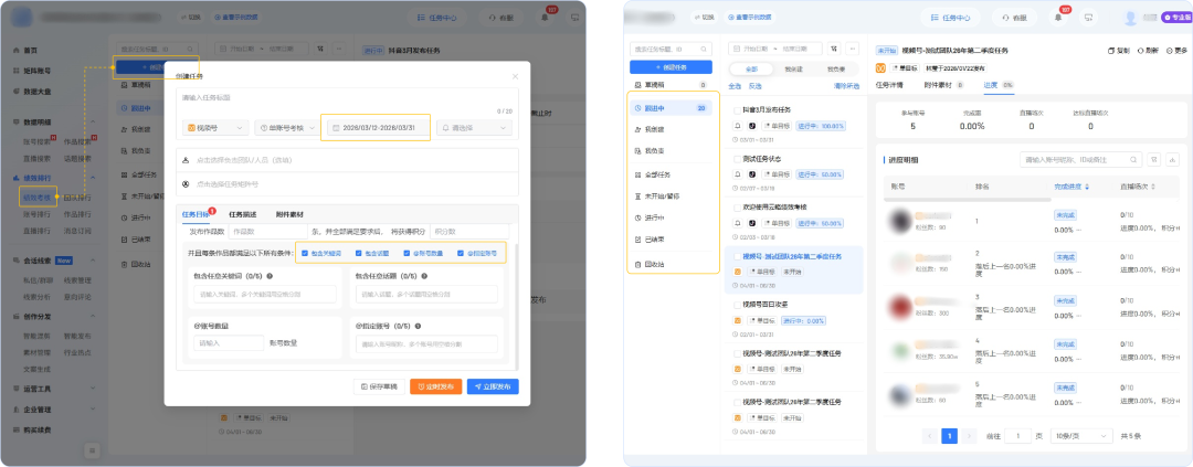 总部可快速创建话题、素材类营销任务,设定执行期限、内容要素、发布要求,精准圈选门店账号定时下发。