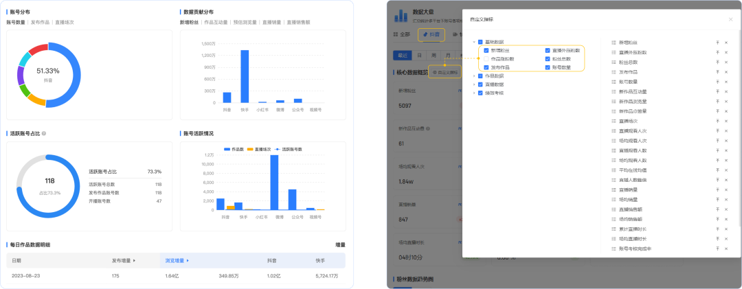 支持单平台自定义指标展示,也可按账号、作品、直播、团队、标签等多维度筛选检索,数据一键导出,无需在多平台反复切换核对。
